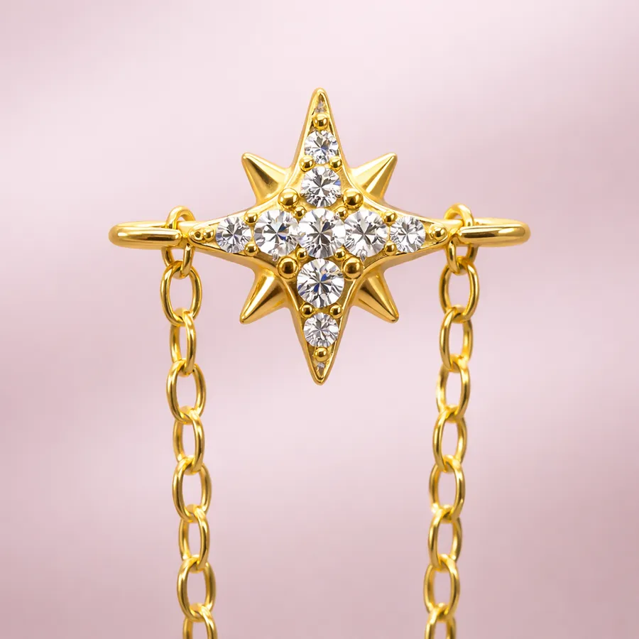 L’élément central représente une étoile scintillante, dont les pierres captent la lumière pour créer un effet lumineux subtil. Cette forme céleste donne au bijou un style poétique et raffiné.