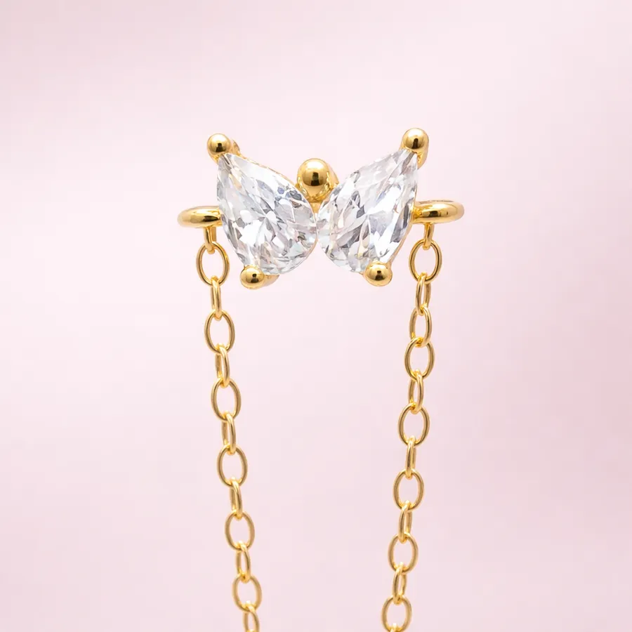 L’élément central représente un papillon lumineux serti de pierres, dont les facettes captent la lumière pour créer un éclat subtil. Ce motif délicat donne au bijou une allure poétique et féminine.