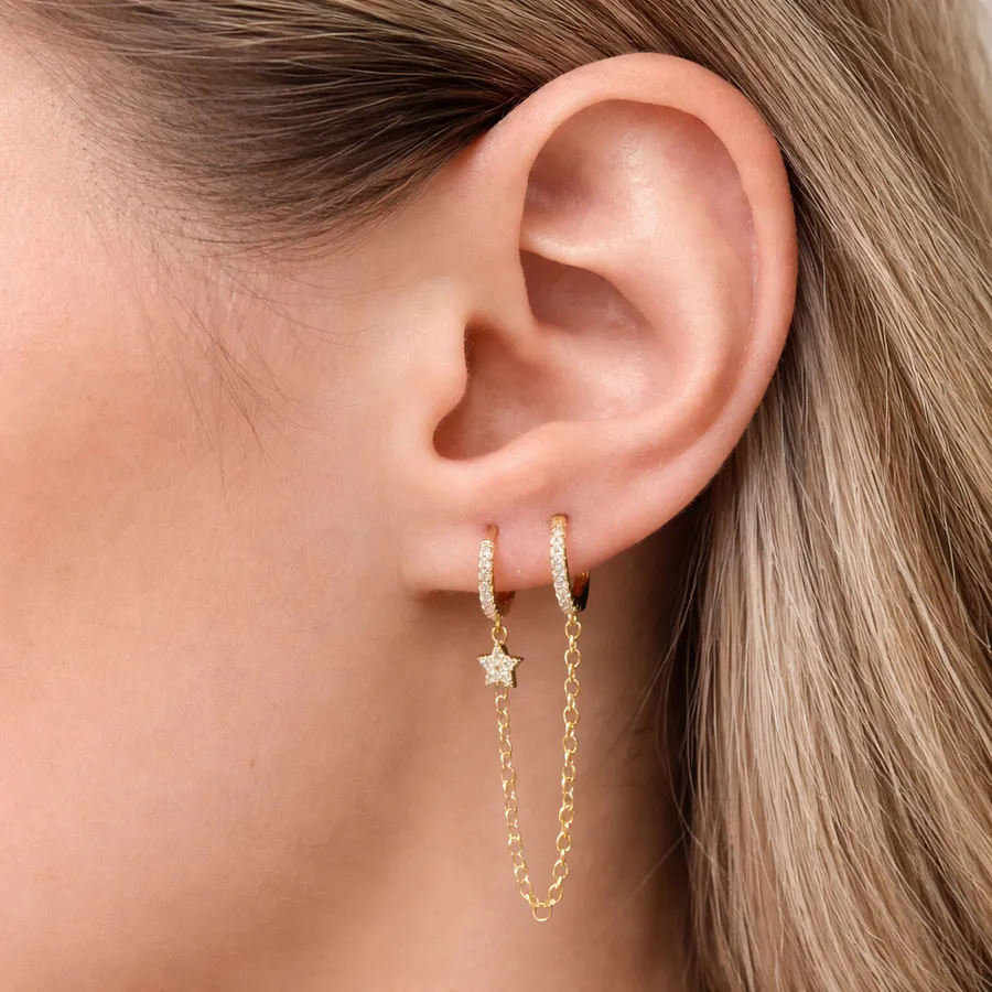 Pensée pour être portée sur deux piercings, elle offre une esthétique unique en créant un lien subtil entre les deux points de l’oreille. L’étoile sertie de pierres apporte une touche lumineuse et vient renforcer le caractère du bijou.