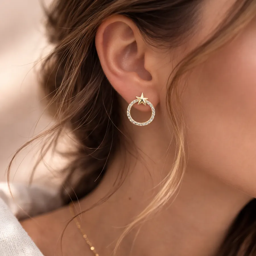 Jolira est une paire de boucles d’oreilles en argent 925, disponibles en finition or ou argent. Son cercle délicatement serti et son étoile centrale apportent éclat et élégance à votre style.