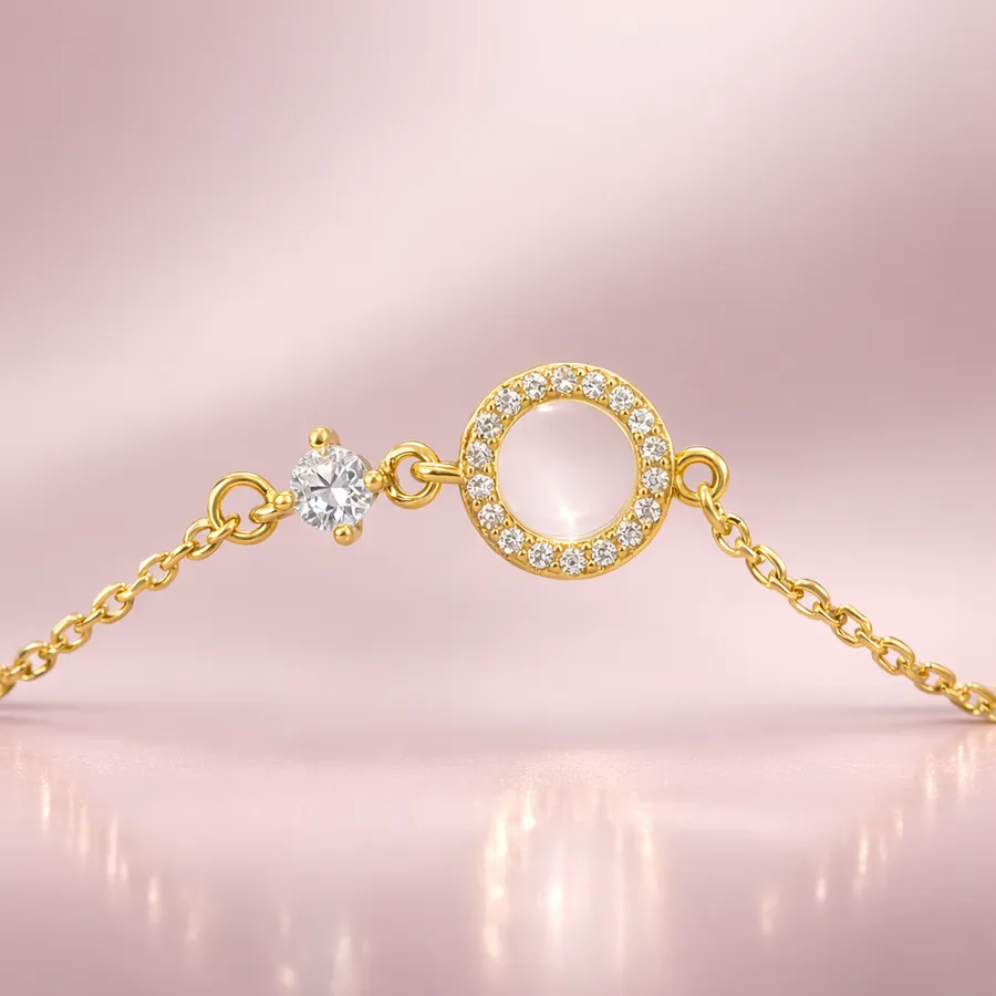 Le motif circulaire évoque l’idée d’un halo lumineux, symbole d’harmonie et d’élégance. Les pierres disposées autour du cercle captent la lumière et créent un effet scintillant subtil qui attire naturellement le regard.