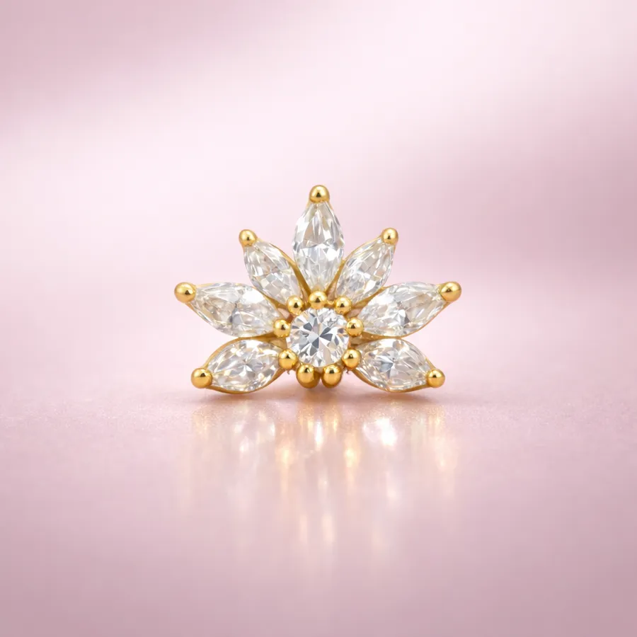 Le bijou peut être porté seul pour un effet délicat ou associé à d’autres piercings afin de créer une composition plus élaborée. Sa finition couleur or accentue l’éclat des pierres et met en valeur les détails du motif floral.